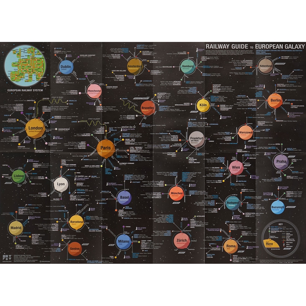 Dieses wunderschöne Railway Map mit den Verbindungen der Fernverkehrszüge in Europa ist sicherlich das Beliebteste von Zeroperzero.