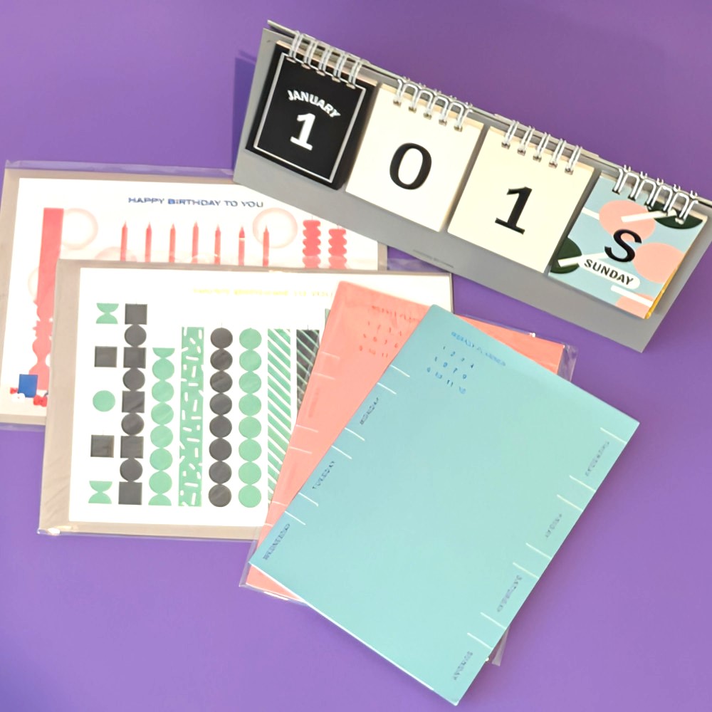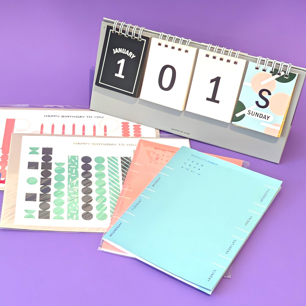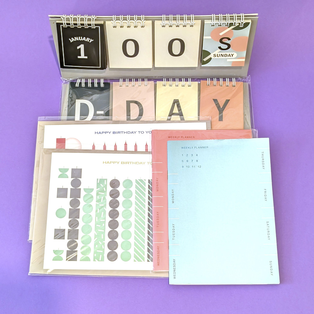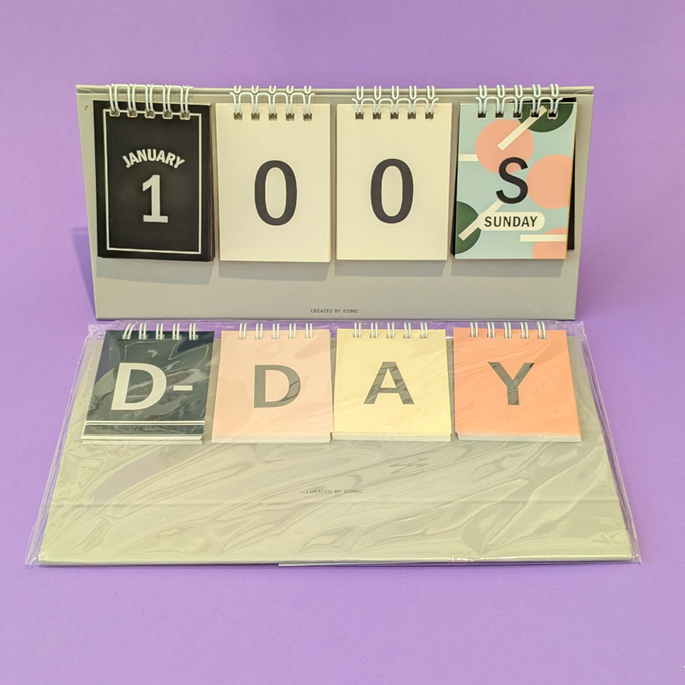 1x immerwährender Tischkalender. Tageskalender auf einer Seite, D-Day Count Down Kalender auf der Rückseite.