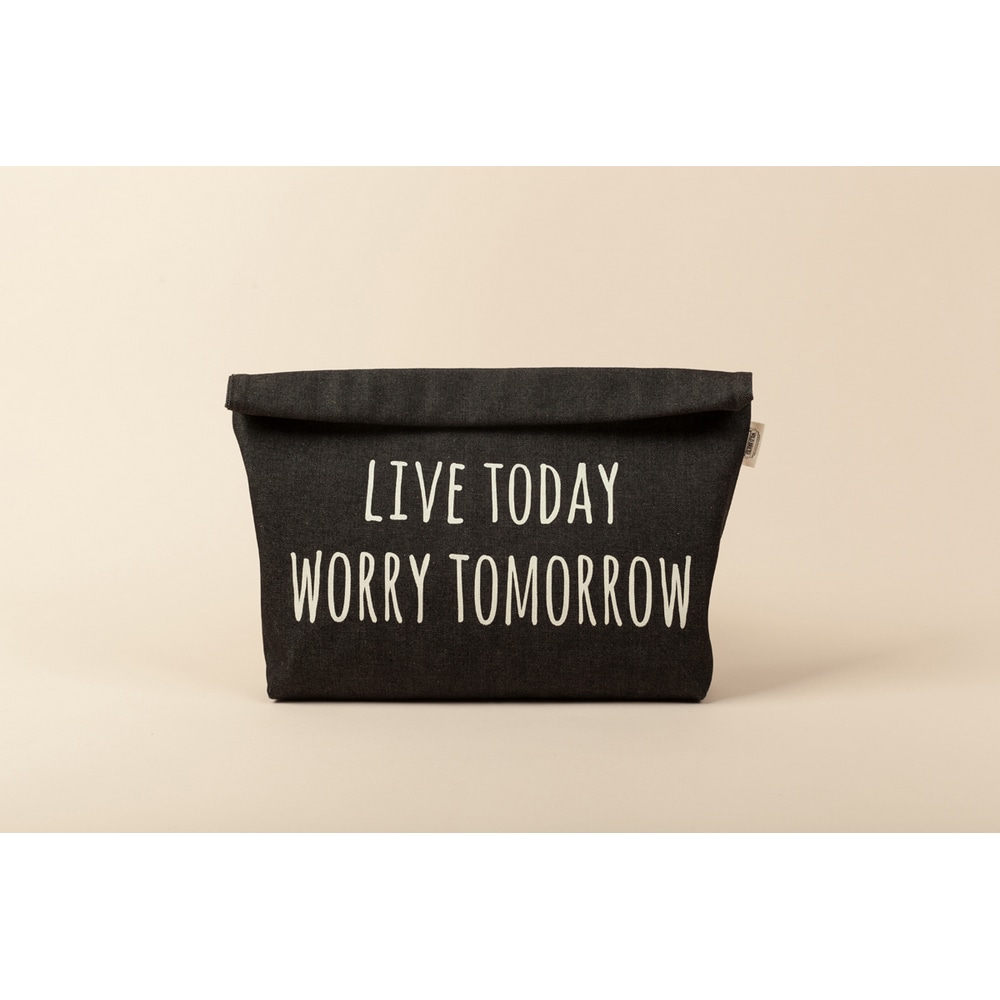 Die „Live Today Worry Tomorrow“ Clutch Bag ist eine handgemachte Tasche aus reiner Baumwolle (Jeansstoff).