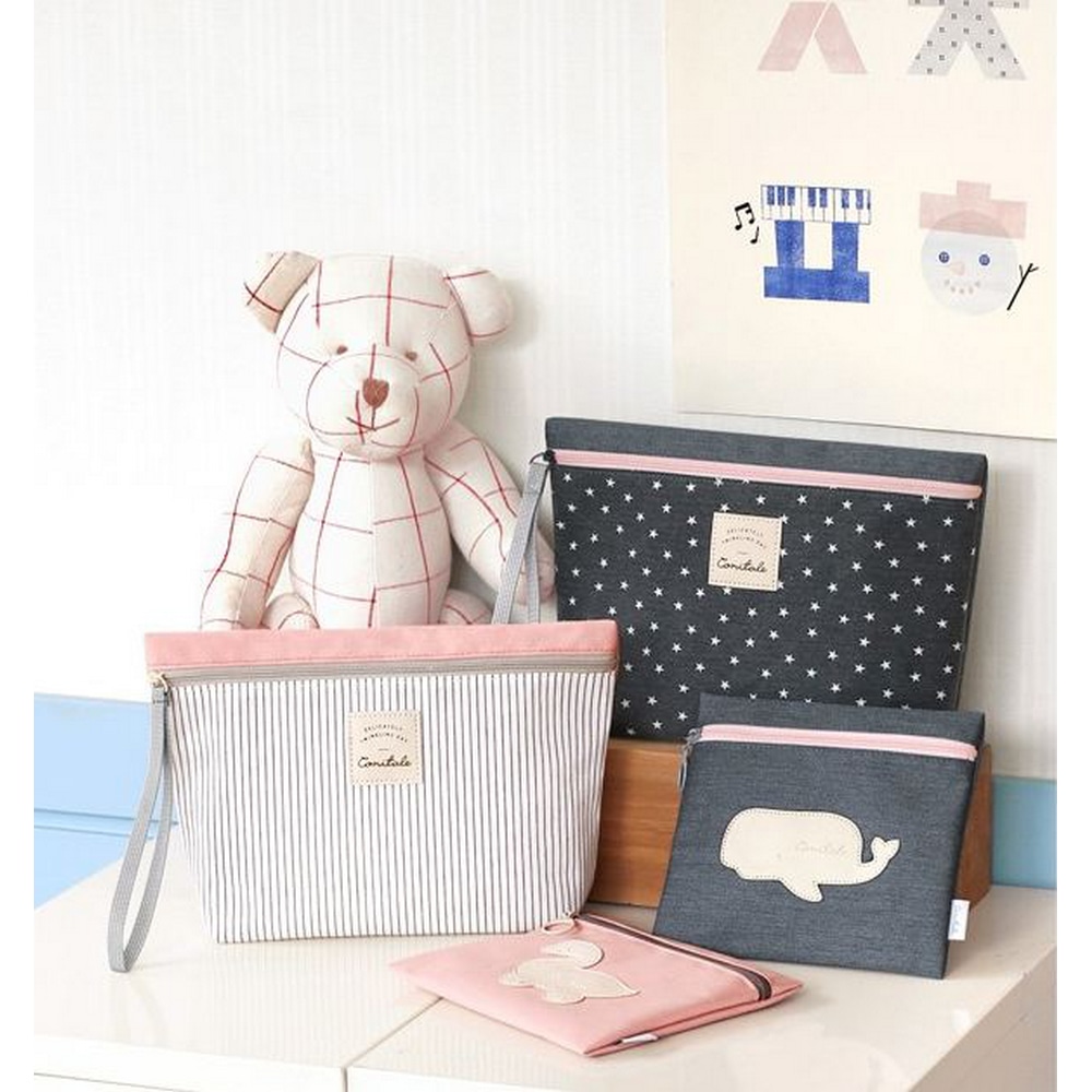 Das Set besteht aus zwei Taschen, eine große Tasche für Windeln und eine kleinere flache Tasche.
