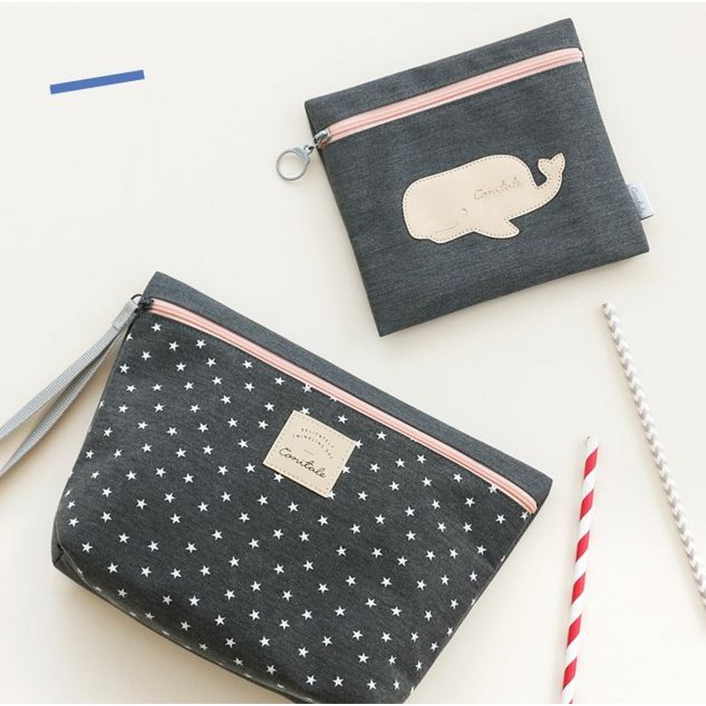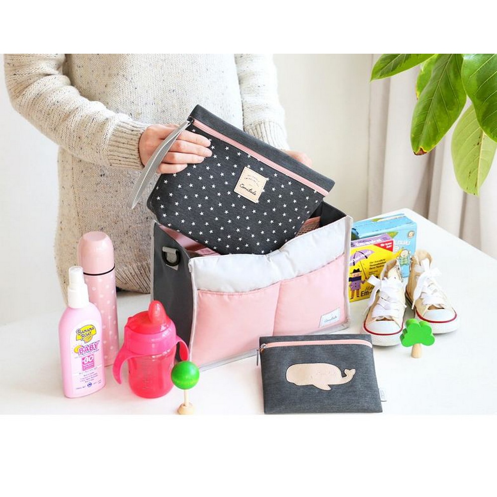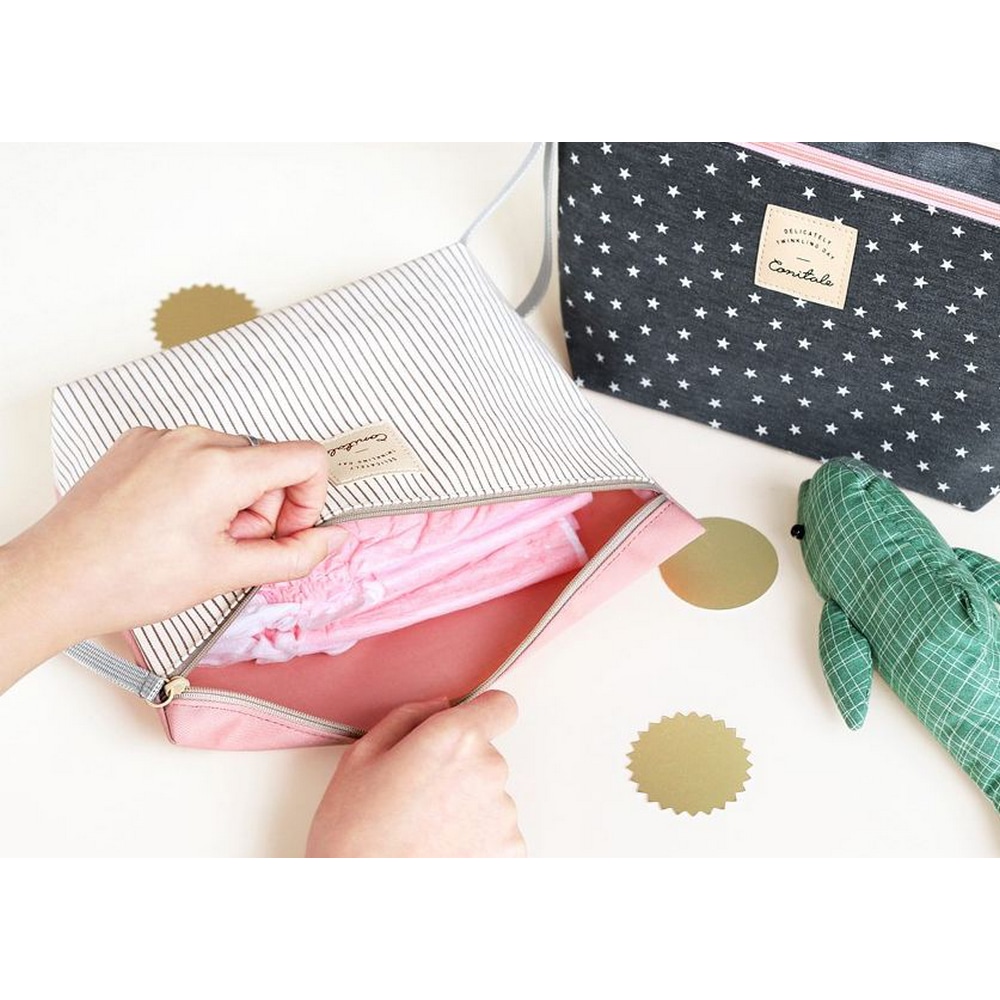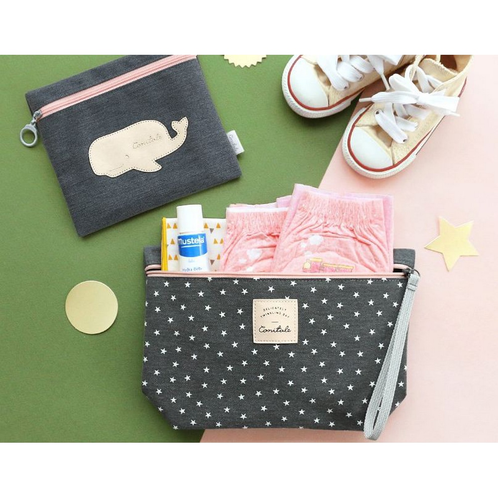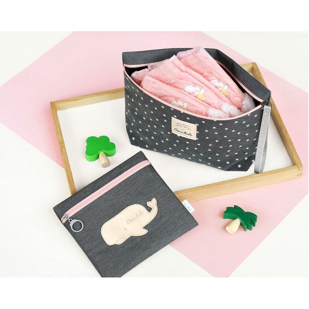 Das Set besteht aus zwei Taschen, eine große Tasche für Windeln und eine kleinere flache Tasche.